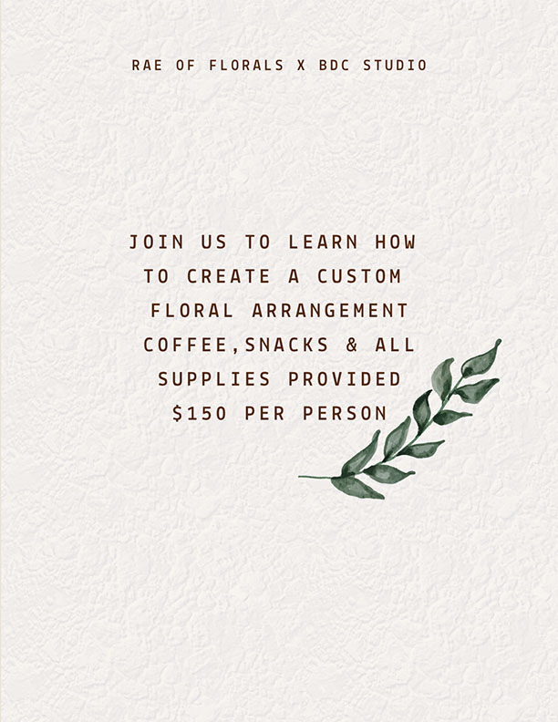 For updates and promotions leading up to the event, follow Rae of Florals and BDC Studios on Instagram!