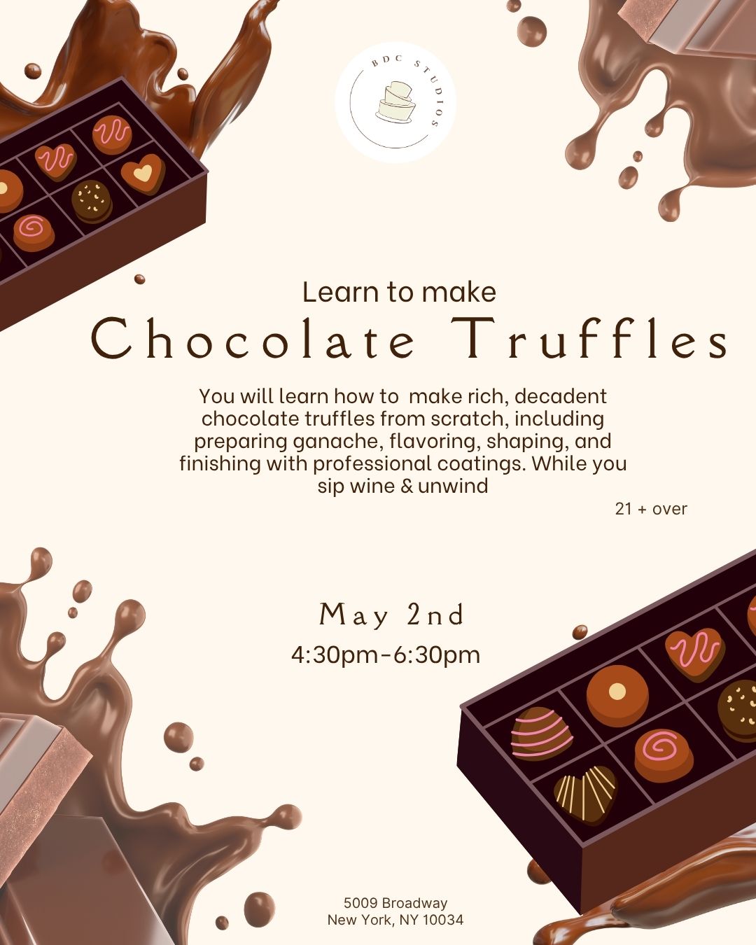 We’ll guide you through simple techniques that will help you create beautiful, bakery-style truffles. By the end of the class, you’ll take home a box of your handmade chocolate truffles to share or enjoy yourself.