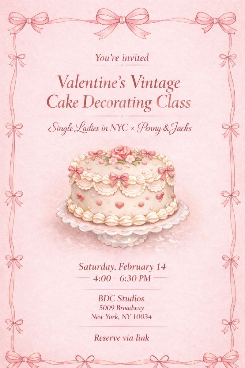 Single ladies in NYC is teaming up with BDC Studios & Penny & Jacks for an intimate, hands-on Vintage Cake Decorating Class, where you’ll learn classic piping techniques and decorate your own romantic, vintage-style cake using soft Valentine-inspired tones.